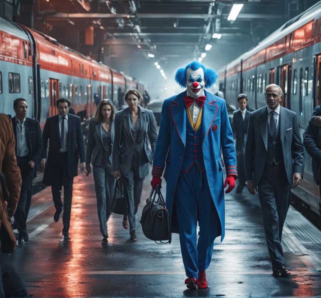 Plötzlich tauchte er auf – ein Clown in einem bunten Kostüm, das in der Dunkelheit leuchtete. Sein Gesicht war weiß geschminkt, mit einem breiten roten Grinsen und großen, schwarzen Augen, die wie tiefe Löcher in seinem Gesicht wirkten. Er trug eine rote Nase und einen großen, bunten Hut, der schief auf seinem Kopf saß. Seine Schuhe waren überdimensioniert und quietschten bei jedem Schritt. Die wenigen Reisenden am Bahnsteig fühlten sich unwohl. Ein mulmiges Gefühl breitete sich in ihren Magen aus. Der Clown schritt langsam den Bahnsteig entlang, sein Lachen hallte durch die kühle Nachtluft. Er schien jeden einzelnen Passanten zu mustern, seine Augen funkelten vor Freude oder vielleicht vor etwas anderem – etwas Dunklem und Unheimlichen. Ein junger Mann mit Kopfhörern in den Ohren bemerkte den Clown zuerst. Er zog seine Kopfhörer ab und starrte ihn an. Der Clown hielt inne und sah ihn direkt an. Für einen kurzen Moment schien die Zeit stillzustehen. Der junge Mann fühlte sich wie gefangen in diesem Blick – als ob der Clown tief in seine Seele blickte und all seine Ängste kannte. „Warte nicht zu lange auf deinen Zug“, rief der Clown mit einer Stimme, die gleichzeitig süß und bedrohlich klang. „Manchmal kommen sie nicht… oder sie bringen etwas mit.“