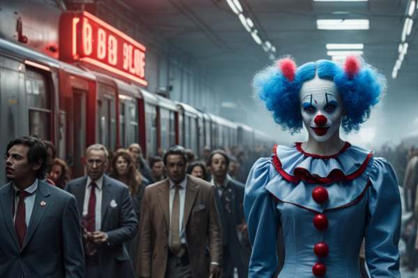 Die schwachen Lichter der alten Neonanzeigen flackerten und warfen gespenstische Schatten auf den Boden.In der Ferne hörte man das Geräusch von Rädern auf Schienen, doch das Geräusch wurde von einem anderen, unheimlicheren Laut übertönt – dem leisen, fröhlichen Lachen eines Clowns. Die Menschen am Bahnsteig sahen sich verwirrt um. Woher kam dieses Lachen? Es klang fröhlich, aber es hatte etwas Unheimliches an sich, als ob es nur dazu diente, die Dunkelheit zu verhüllen.