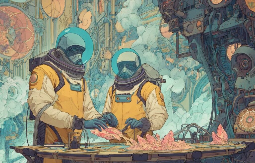 Im Hintergrund stehen die zwei Raumfahrer, noch immer mit abgenommenen Helmen, nun direkt Zeugen dieser Transformation. Ihre Gesichter spiegeln Ehrfurcht, Angst und Staunen. Einige der Wesen strecken erste zarte Gliedmaßen aus und berühren vorsichtig die menschlichen Beobachter, als wollten sie die Grenze zwischen biologischem Leben und Kristallenergie prüfen.