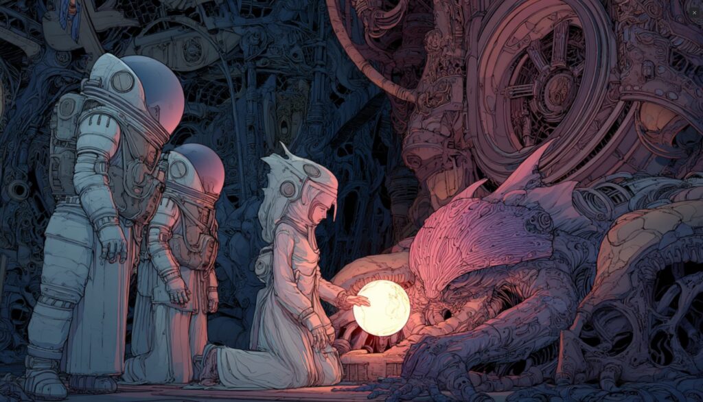 Ein tiefer, vibrierender Ton erfüllte den Tempel – weder ganz Klang noch ganz Gedanke. Die beiden Menschen in Raumanzügen hielten den Atem an. Einer von ihnen murmelte: „Es lebt… oder es wird etwas anderes.“