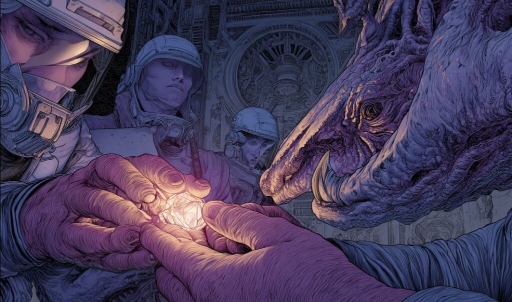 Die ältere Wissenschaftlerin greift nach dem Splitter, der in der Luft vor ihnen schwebt, während ihr Kollege die Hand hebt, um ihn zurückzuhalten. Doch der Kristall pulsiert stärker, seine Lichtadern winden sich um sie, und in jedem von ihnen beginnt ein tiefes Wissen aufzublitzen: vergangene Expeditionen, fremde Technologien, fremde Biologie, selbst die Grenzen von Raum und Zeit werden sichtbar.