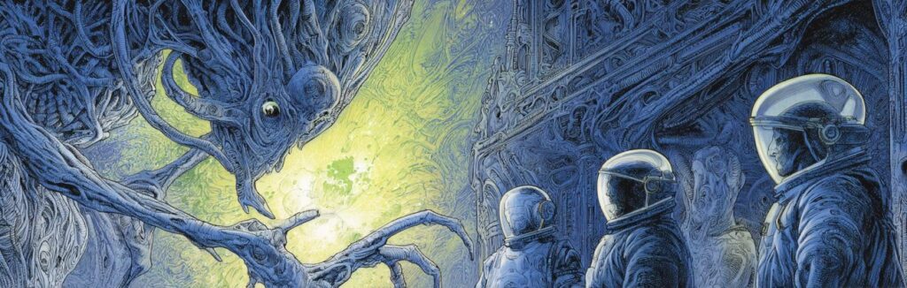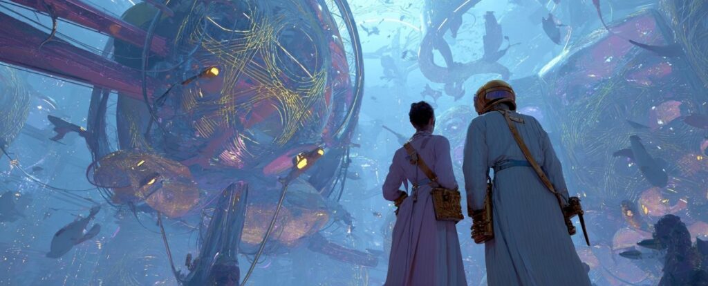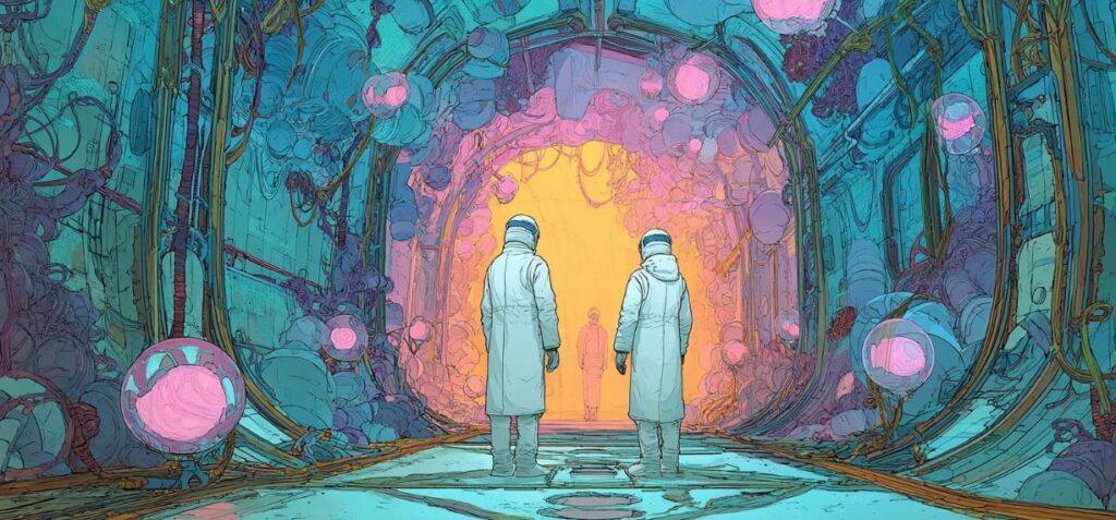 Vor ihren Augen materialisieren sich alternative Versionen der Raumstation, fremde Planeten, und seltsame, fast mythische Kreaturen aus Licht und Schatten. Die Silhouette des Raumanzugs zerfällt, und aus den Kristalladern formt sich eine neue Präsenz — ein Wesen aus reiner Information, das die beiden willkommen heißt.
