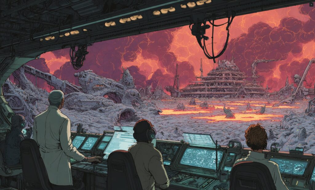Die Mannschaft überprüfte die Waffen — keine Projektilwaffen, sondern schmale Plasmaklingen und organische Geräte, halb Technologie, halb Biologie. Der Wissenschaftsoffizier befestigte eine Datenphiole an seinem Gürtel. „Wenn das Ding da unten wirklich kommuniziert, müssen wir zuhören, bevor es lernt, zu schreien.“