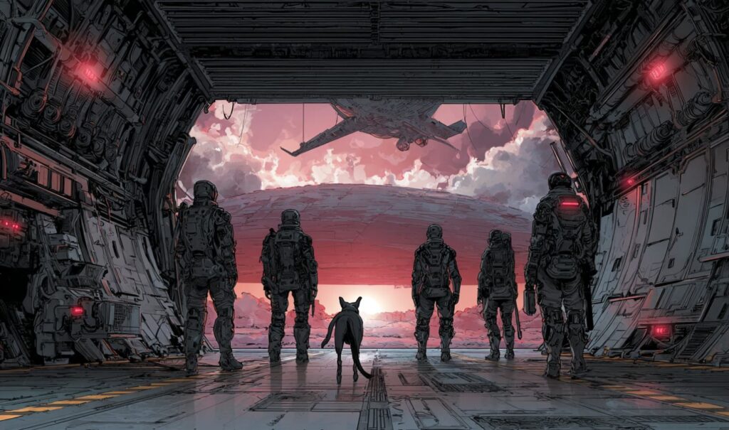 Das Notlicht tauchte die Hangarbucht in pulsierendes Rot. Zwischen den Reihen schwebender Transportmodule standen fünf Gestalten in schwarzen Exosuits, jeder Helm mit schwach blauer Innenbeleuchtung. In der Mitte hockte ein Hund — kein gewöhnlicher, sondern ein genetisch modifizierter Spürhund mit implantierten Sensorfäden entlang des Rückens, die bei jeder Bewegung in kurzen Lichtwellen pulsierten.