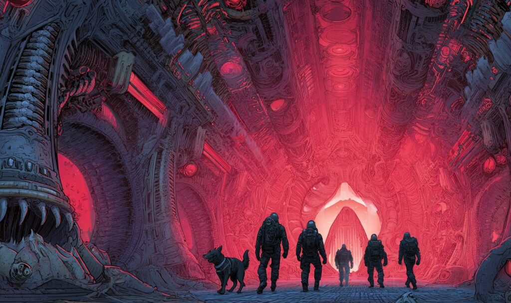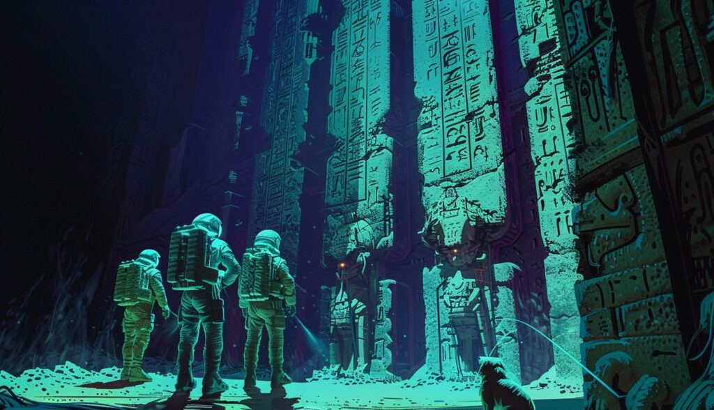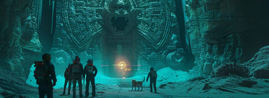 Fünf Astronauten und ihr treuer Hund treten vorsichtig in einen Tempel ein, dessen Wände von unheimlichen, sich verschmelzenden Alien-Figuren bedeckt sind. Jeder Schritt hallt in den gewölbten Hallen wider, als ob die Struktur selbst auf ihre Präsenz reagiert. Ein kühler, metallischer Geruch liegt in der Luft, und die Schatten scheinen sich zu bewegen.