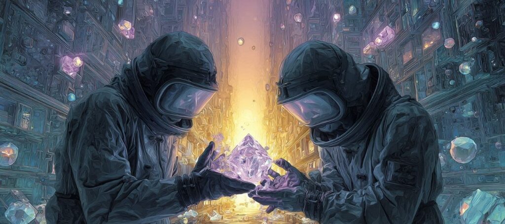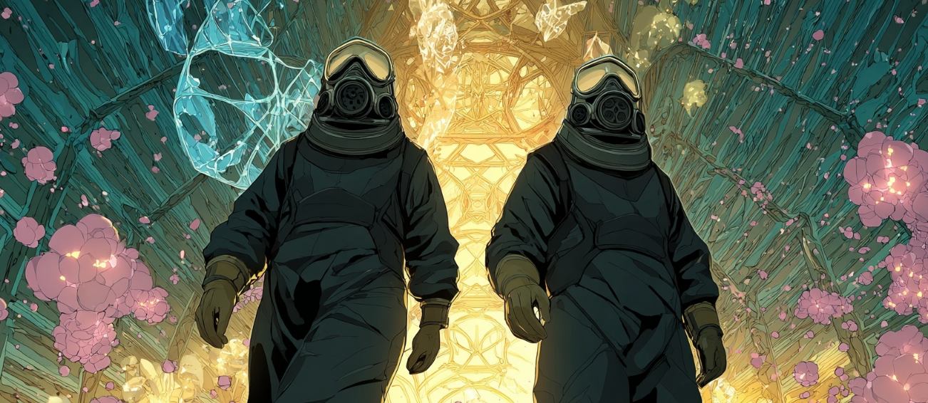 Die beiden Wissenschaftler taumeln zurück, von Visionen fremder Welten überwältigt. Der Kristall, der jetzt wie ein lebendiges neuronales Netz durch den Korridor fließt, scheint ihre Gedanken zu lesen.