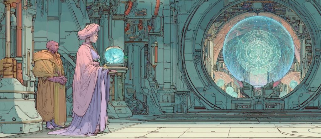 Die Priesterin lehnt sich über einen schwebenden Kristall in der Mitte des Kontrollraums. Ihr Gesicht ist ernst, Augen weit geöffnet, in ihnen spiegeln sich die Lichtadern der Kristallgestalten. Jede Falte ihres Gewands reflektiert das schimmernde Licht der holografischen Displays.