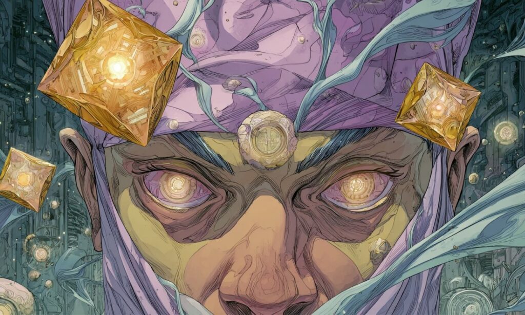 Plötzlich löst sich ein kleiner Kristallsplitter von der Hand und schwebt direkt auf die Wissenschaftler zu. Er berührt sanft ihre Helme — und sofort erscheinen Visionen: fremde Welten, zerbrochene Raumstationen, seltsame Kreaturen aus Licht und Schatten.