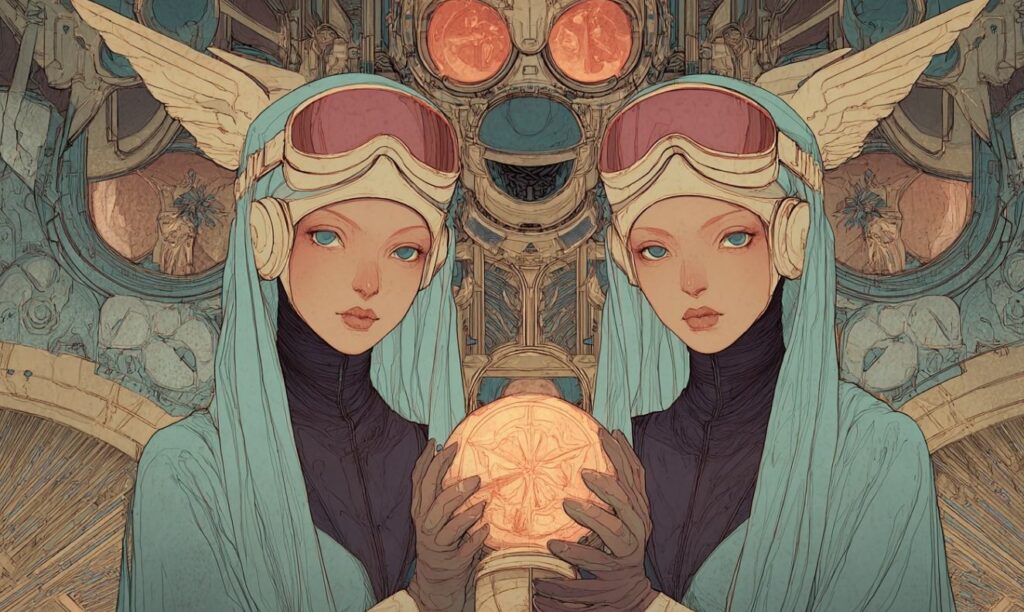 Die schwebenden Glasblasen vibrieren leicht und spiegeln Bruchstücke ihrer Gesichter, verzerrt und flackernd, während die Hologramme auf ihren Tablets unaufhörlich neue Muster überlagern, die kein Algorithmus erklären kann.