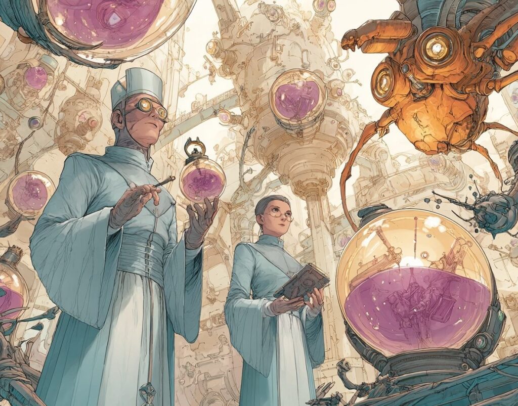 Die beiden jungen Priesterinnen stehen vor einem riesigen, schwebenden Glasbehälter, in dem ein fremdartiges, noch embryonales Lebewesen in leuchtender Flüssigkeit liegt. Die Priesterinnen bewegen sich elegant, jedes Gewand fließt wie lebendige Tinte, und halten ihre seltsamen Gefäße mit leuchtender Kristallenergie bereit.