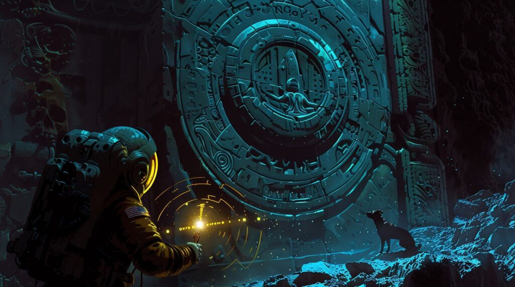Der Hund knurrt leise, seine Ohren gespitzt, die Nase zittert. Die Astronauten spüren gleichzeitig Ehrfurcht und Furcht. Die Luft ist schwer und vibrierend, als stünde das Tor selbst unter Spannung. Jeder Atemzug hallt in der Grotte wider.