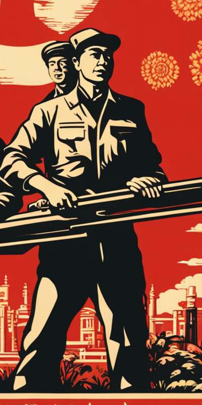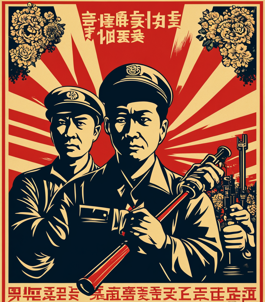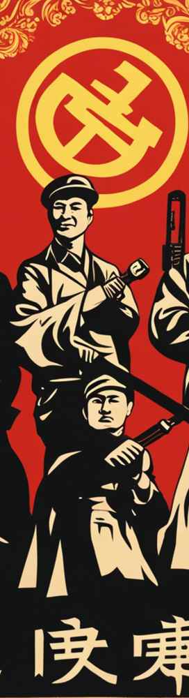 Die Zeilen dieses Liedes durchziehen das Bild wie ein unsichtbarer Strom und erinnern daran, dass es nicht nur um Waffen, sondern auch um Ideen geht, die Berge versetzen. In den Liedern wird Mao Zedong als „die rote Sonne in unseren Herzen“ gefeiert, ein Führer, der wie ein Leuchtturm den Weg durch die Stürme der Revolution weist.