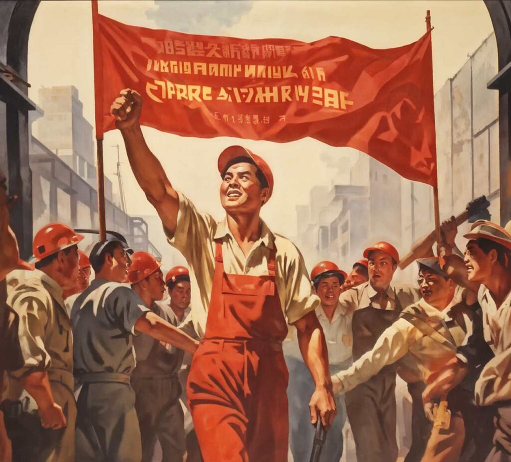 - Kommunistische Propaganda: In der Sowjetunion und der Volksrepublik China wurden sozialistischer Realismus und kühne Farbkompositionen bevorzugt. Bilder von Arbeitern, Bauern und Soldaten waren heroisch inszeniert, oft vor leuchtend roten Hintergründen, die Kraft und Einheit symbolisierten. Diese Kunstform betonte kollektive Ideale und zielte darauf ab, die Bevölkerung von der Überlegenheit des sozialistischen Systems zu überzeugen.