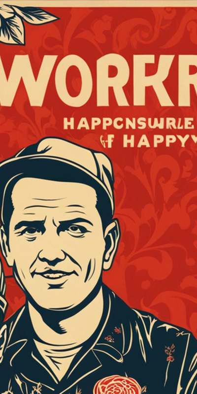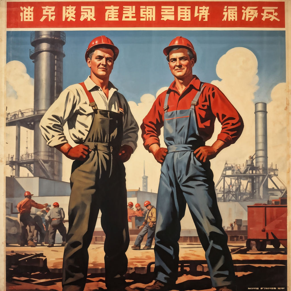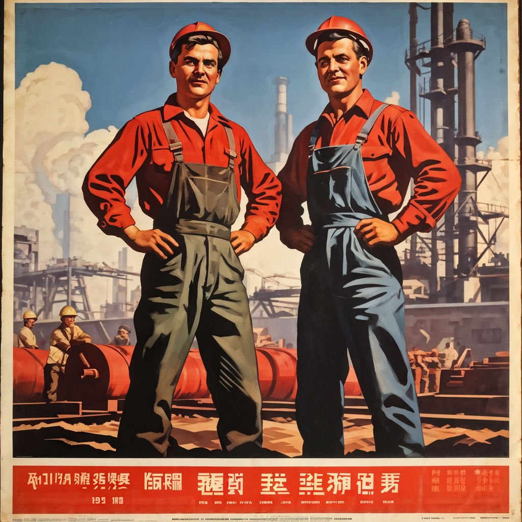 „In diesem kraftvollen Propagandabild offenbart sich die unerschütterliche Einheit unseres sozialistischen Staates unter der weisen Führung unseres geliebten Vorsitzenden. Im Vordergrund stehen stolz zwei Helden der Arbeiterklasse, ihre muskulösen Körper Zeugnis unermüdlichen Einsatzes für unser Vaterland.