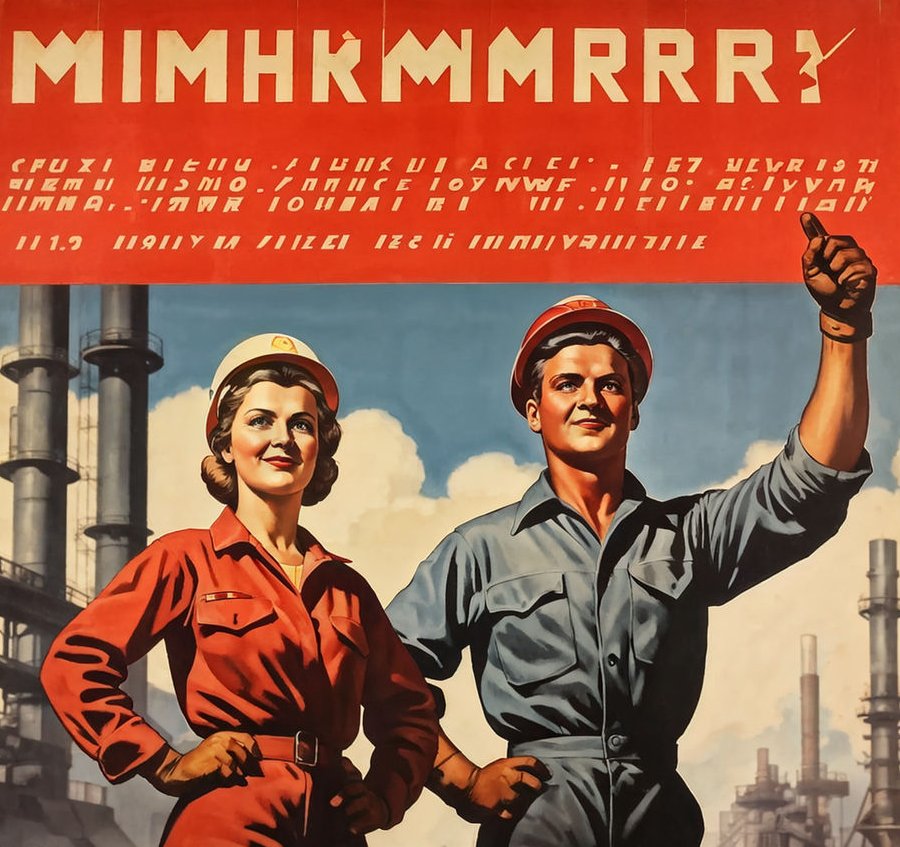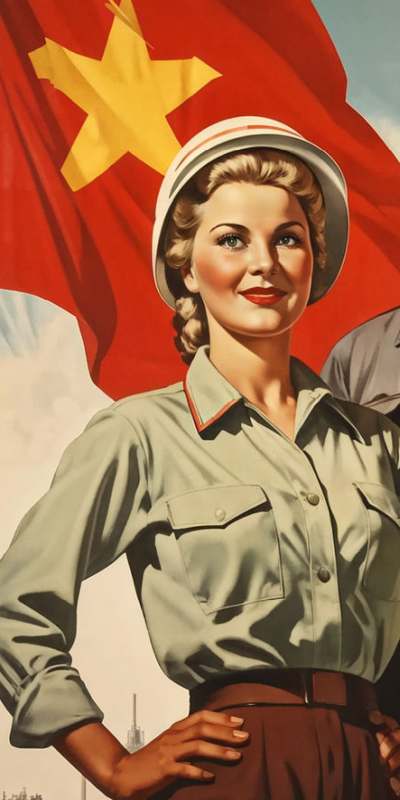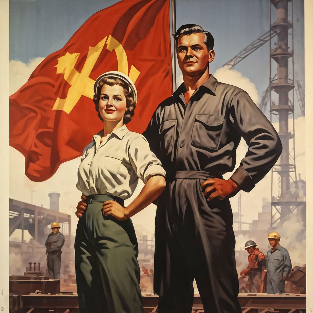 Hier einige AI-erstellte Beispiele im Stil der Propagandabildern aus der Zeit des kalten Krieges.