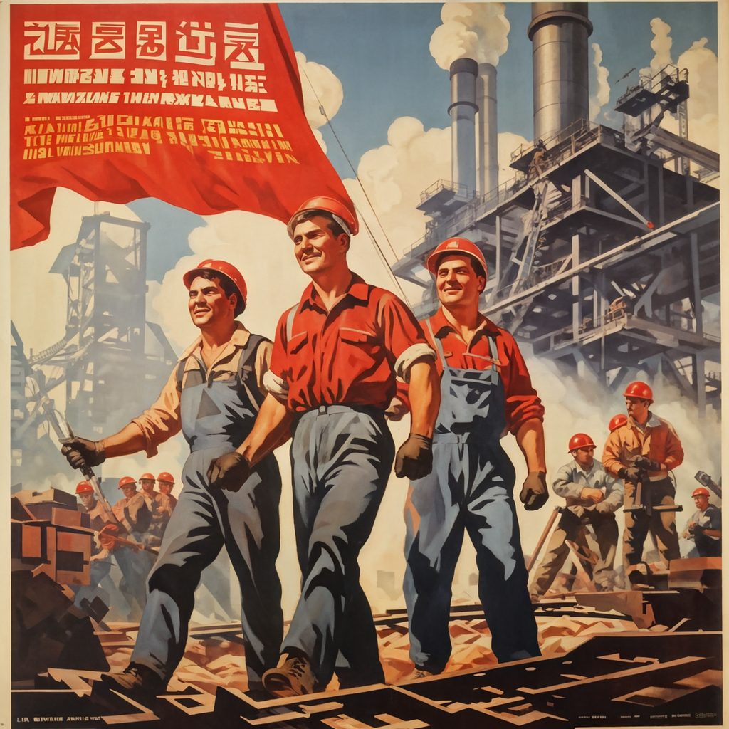 Der Himmel selbst scheint den Traum zu spiegeln: makellos, weit und grenzenlos. Zwischen den Industrieanlagen und dem Himmel weht eine prachtvolle rote Fahne, deren lebhaftes Rot die Herzen der Betrachter ergreift. Das goldene Emblem von Hammer und Sichel glänzt darauf wie eine Sonne der Hoffnung.