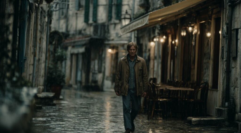 Ich lag eng gefaltet in seiner Brusttasche, aber meine Aufmerksamkeit war weit geöffnet. Ich hörte nicht nur das rhythmische Rascheln seines Schritts auf dem nassen Pflaster – ich hörte das Gewicht seiner Vergangenheit bei jedem Aufsetzen des Absatzes.