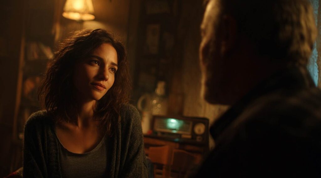 Die junge Frau steht nun direkt vor ihm, ihr Blick fest und doch sanft, als wolle sie ihm eine Kraft schenken, die er lange nicht mehr gespürt hat. Ihre Stimme bricht die Stille, warm und ruhig, als erzähle sie eine alte, vertraute Geschichte, die sie selbst oft gehört hat.