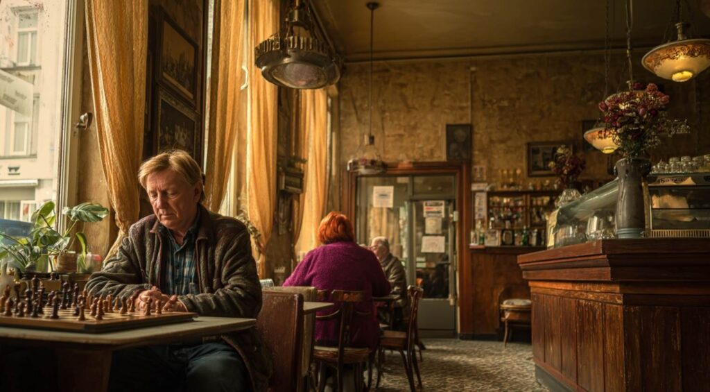 Ein älterer Herr schlürfte an einer Tasse Tee und blickte angestrengt auf ein Schachbrett, obwohl ihm kein Gegenspieler gegenübersaß.