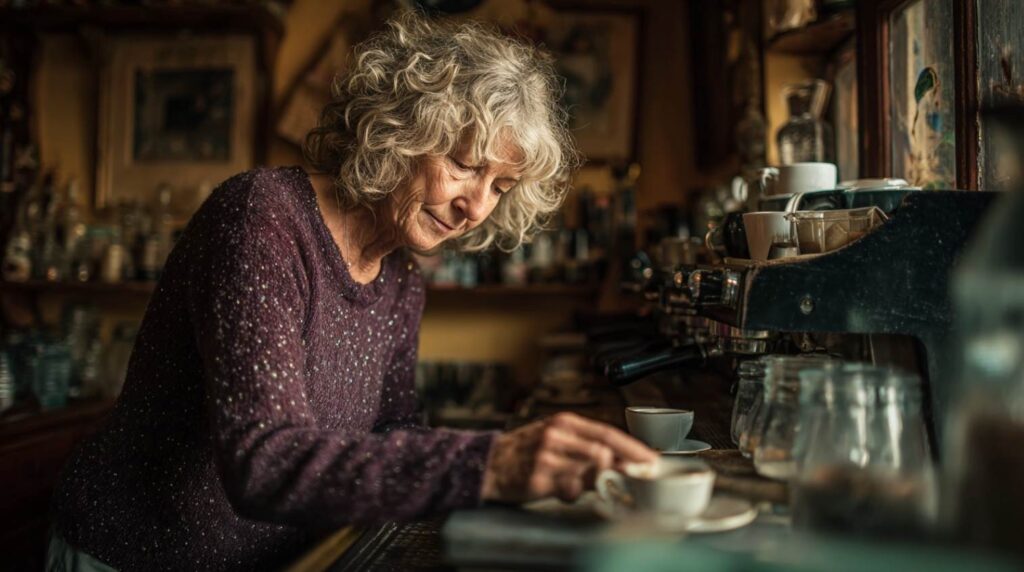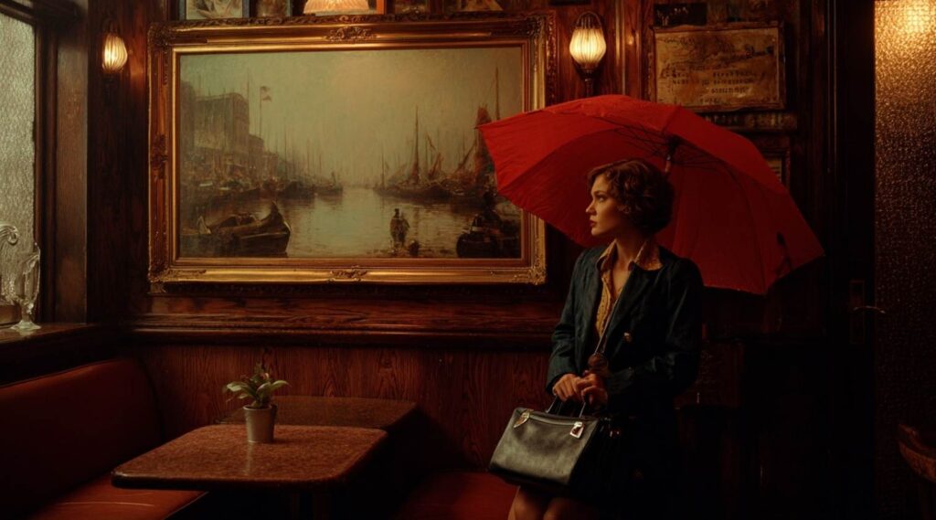 Um uns herum sitzen Menschen, jeder ein eigenes Kapitel. Da ist die alte Dame mit dem silbergrauen Haar, deren Augen ein Geheimnis bergen, das nie ganz gelüftet wurde. Ein Mann mittleren Alters liest still eine Zeitung, seine Stirn in sorgenvoller Falte. In der Ecke lacht ein Paar leise, die Finger verschlungen, als könnten sie die Zeit anhalten.