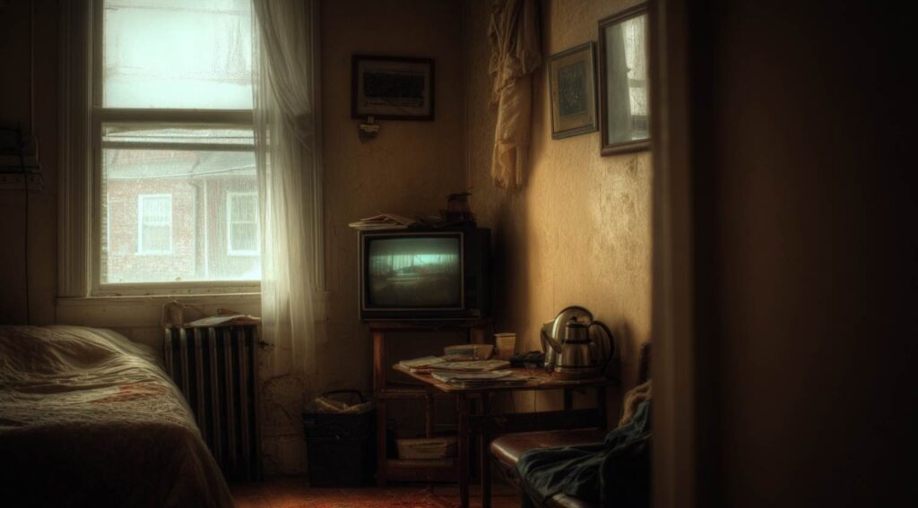 Die Pension, Zimmer 2B, Blick auf den Hinterhof. Fernseher mit halbfunktionierendem Empfang. Ein Wasserkocher, der sich weigert, bei weniger als einer Tasse Wasser zu arbeiten.