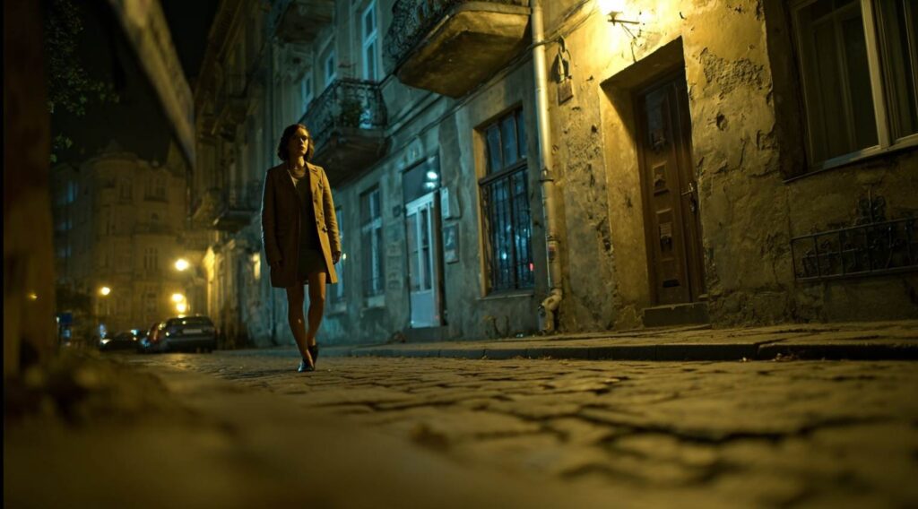 Draußen empfängt uns die klare Luft der Nacht, die Stadt glänzt nass unter dem Schein der Laternen, doch hier, an dieser Straße, herrscht eine gespenstische Stille. Die Geräusche sind gedämpft: das entfernte Klirren einer Flasche, das leise Rascheln von Papier in einem Windstoß. Der Asphalt reflektiert die Lichter der Stadt, als wolle er eine zweite Welt unter sich eröffnen.