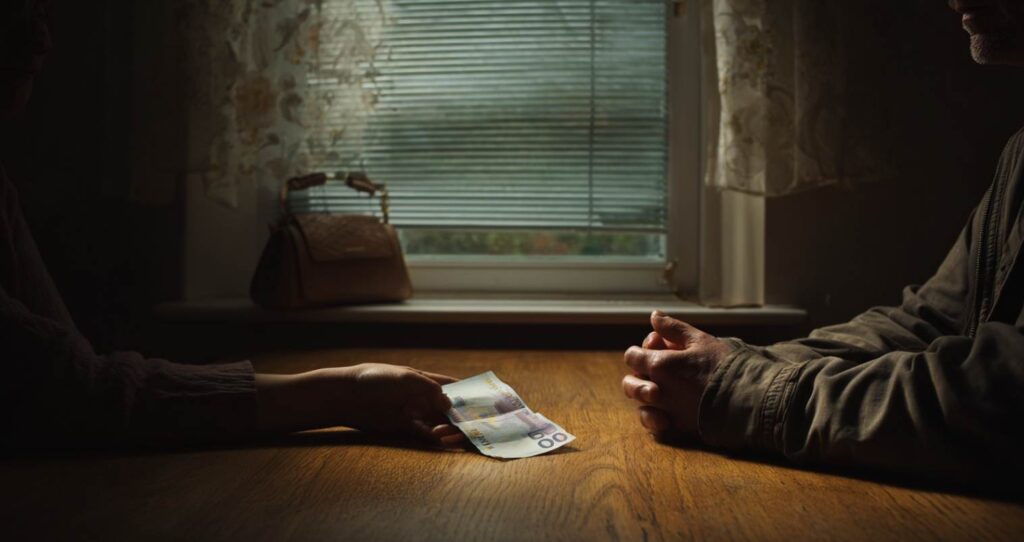 Kaum in der Jacke von Lars, spüre ich den festen Griff, mit dem er mich umschließt – als wäre ich nicht bloß ein 20-Euro-Schein, sondern ein Teil seiner Geschichte, ein stummer Begleiter durch die Dunkelheit.